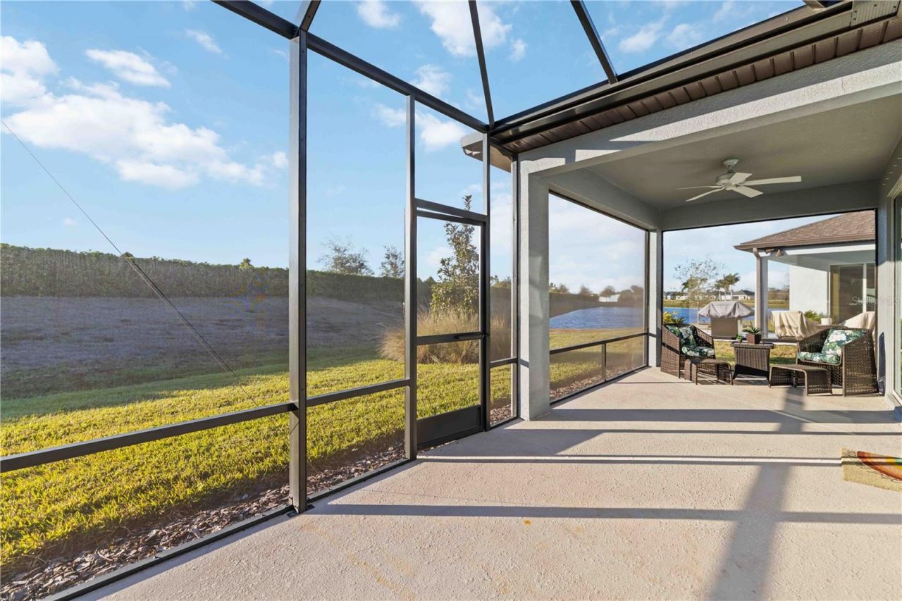 Welcome to Bayview, an exceptional 55+ gated & golf cart community where you can live everyday like you're on vacation Discover new friends, become involved in many social activities, enjoy state of the art amenities including a nearly 25,000 sqft amenity center, resort style pool with cabanas and resistance pool, our own restaurant the Sailfish Grill with full bar inside & out, flat screen tv's, billiard tables, bandshell area for live entertainment, dock on water with kayak launch, corn toss, bocce ball/pickleball/tennis/shuffleboard courts, hot tub, fire pit sitting area, walking trails, dog park, fitness center, garden center, garden club and much more. The open-concept floor plan is enhanced by an abundance of windows, creating a bright and inviting atmosphere throughout. The modern kitchen showcases stylish gray cabinetry, quartz countertops, brushed nickel hardware, natural gas, a closet pantry, Whirlpool stainless steel appliances, a mosaic tile backsplash, and pendant lighting over a large center island-perfect for cooking and entertaining. Step into this beautiful, light-filled home featuring 2 bedrooms, 2 bathrooms, and a versatile flex/office room with elegant double French doors.Additional features include 8-foot interior doors throughout and ceiling fans for added comfort. The spacious primary suite offers a spa-like bathroom with dual sinks, a large walk-in shower with seating, and convenient linen closet storage. The primary closet is thoughtfully designed with a built-in organizer for optimal functionality. Relax in the expansive gathering and living area that opens to an oversized screened lanai, where you'll enjoy serene water views to the right. Unwind in the backyard and take in breathtaking sunset views-your perfect Florida retreat.The garage has an extra 4 foot extension for extra storage space. HOA includes, shrubs, lawn, trimming, reclaimed water for irrigation, internet & cable, private roads, guard at gate, virtual gate after hours. The Sailfish Grill is 410.00 per year which you get to spend each year that amount free. With easy access to I-75, you're just a short drive from the Gulf of Mexico beaches, shopping, dining, and Tampa, St. Petersburg, Bradenton, and Sarasota. Experience the perfect blend of luxury and location in this pet-friendly oasis. Come see this beautiful home today.